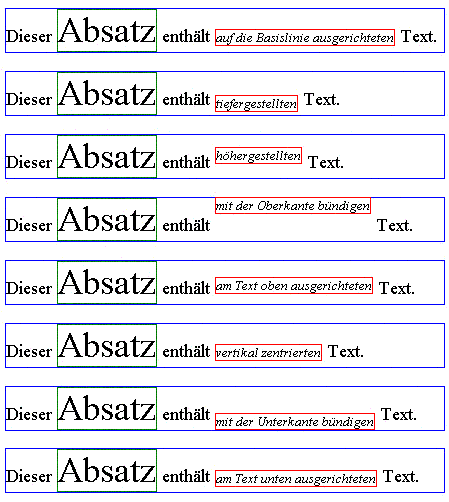 <!DOCTYPE HTML PUBLIC "-//W3C//DTD XHTML 1.0 Strict//EN" "http://www.w3.org/TR/xhtml1/DTD/xhtml1-strict.dtd"> <html xmlns="http://www.w3.org/1999/xhtml" xml:lang="de"> <head> <title>Vertikale Ausrichtung</title> <style type="text/css"> p { border: 1px solid blue; font-size: 20px; } span { font-size: 40px; border: 1px solid green; } em { border: 1px solid red; font-size: 14px; } </style> </head> <body> <p>Dieser <span>Absatz</span> enthält <em style="vertical-align:baseline">auf die Basislinie ausgerichteten</em> Text.</p> <p>Dieser <span>Absatz</span> enthält <em style="vertical-align:sub">tiefergestellten</em> Text.</p> <p>Dieser <span>Absatz</span> enthält <em style="vertical-align:super">höhergestellten</em> Text.</p> <p>Dieser <span>Absatz</span> enthält <em style="vertical-align:top">mit der Oberkante bündigen</em> Text.</p> <p>Dieser <span>Absatz</span> enthält <em style="vertical-align:text-top">am Text oben ausgerichteten</em> Text.</p> <p>Dieser <span>Absatz</span> enthält <em style="vertical-align:middle">vertikal zentrierten</em> Text.</p> <p>Dieser <span>Absatz</span> enthält <em style="vertical-align:bottom">mit der Unterkante bündigen</em> Text.</p> <p>Dieser <span>Absatz</span> enthält <em style="vertical-align:text-bottom">am Text unten ausgerichteten</em> Text.</p> </body> </html>